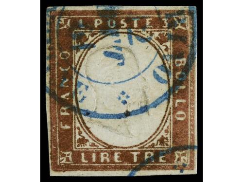 ° ITALIA ANTIGUOS ESTADOS: CERDEÑA. Yv. 15. 1855-63. 3 liras bronce. Mat. fechador en azul. BONITO EJEMPLAR. Cert. RAYBAUDI.