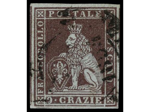 ° ITALIA ANTIGUOS ESTADOS: TOSCANA. Yv. 8. 1851. 9 cr. castaño lila. Márgenes excepcionales. PRECIOSO.