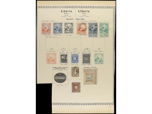 */° LIBERIA. 1860-80. Página de álbum con sellos nuevos y usados, también enteros postales recortados.