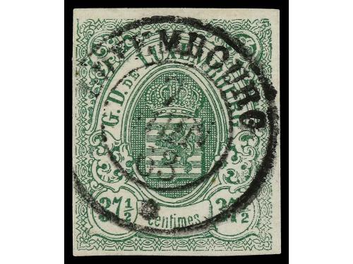 ° LUXEMBURGO. Yv. 10. 1859-63. 37 1/2 cts. verde. Mat. fechador LUXEMBOURG. PRECIOSO. Cert. MERKUR.
