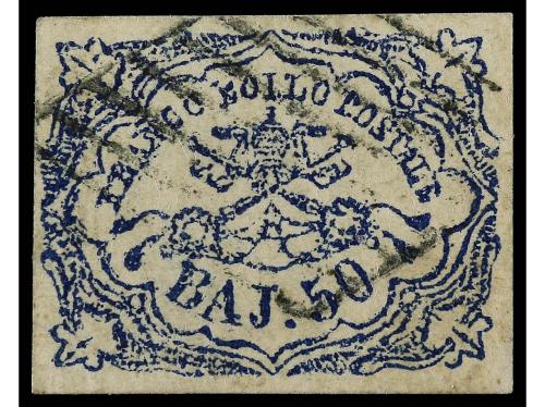° ITALIA ANTIGUOS ESTADOS: ESTADOS PONTIFICIOS. Yv. 10A. 1864. 50 baj. azul. Impresión defectuosa. Grandes márgenes. MAGNÍFICO EJEMPLAR. Cert. E. DIENA.