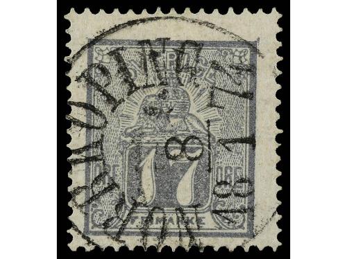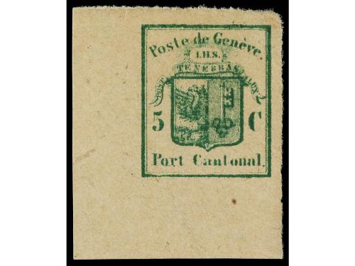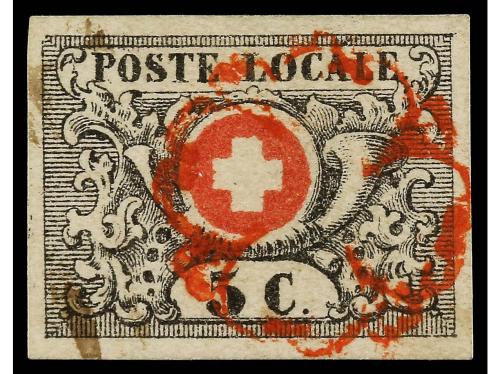 ° SUIZA. Yv. 3A. 1845-48. 5 cts. negro s. verde oscuro. Mat. roseta en rojo. MAGNÍFICO. Cert. HUNZIKER y EICHELE.