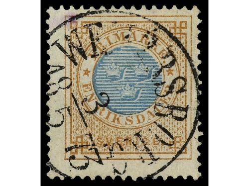 ° SUECIA. Yv. 25. 1872-85. 1 r. bistre y azul. MUY BONITO.