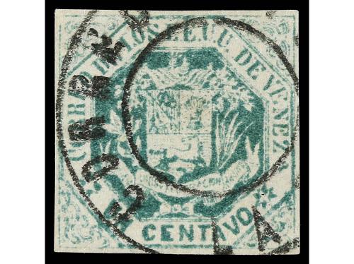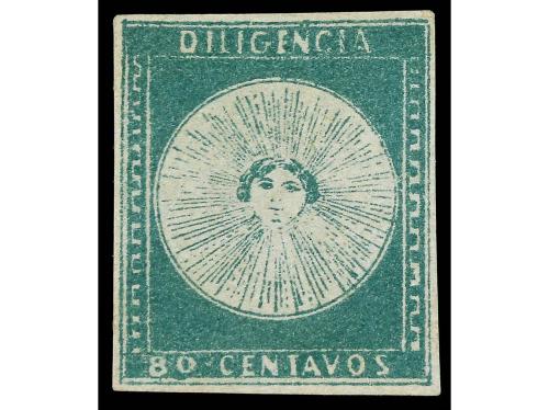 (*) URUGUAY. Yv. 2. 1856. 80 ctvos. verde. Grandes márgenes. PRECIOSO. Cert. EICHELE.
