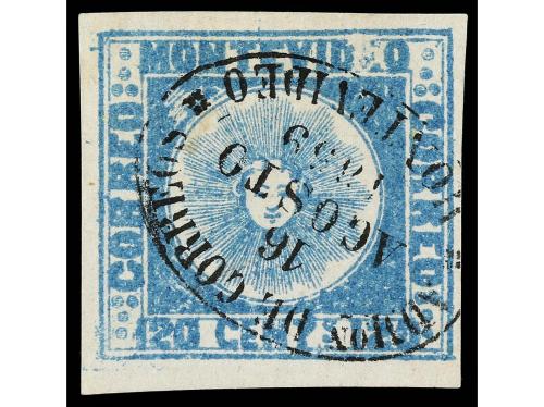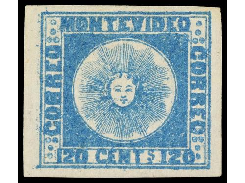 ° URUGUAY. Yv. 4. 1858. 120 ctvos. azul. PRECIOSO. Cert. SHELLER.
