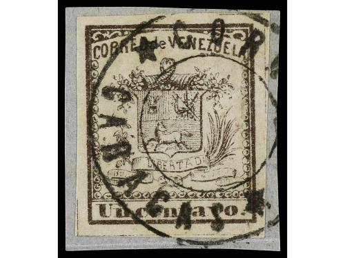 Δ VENEZUELA. Yv. 7. 1861. 1 ctvo. castaño sobre pequeño fragmento. Mat. CORREOS / CARACAS.