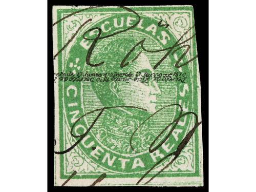 ° VENEZUELA. Yv. 13B. 1871. ESCUELAS. 50 reales verde. Margen derecho muy ajustado.