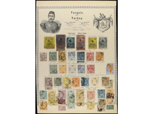 ° TURQUIA. 1863-1885. Cinco hojas de álbum con sellos usados con preciosos matasellos, muchas piezas raras y con variedades, también enteros postales recortados.