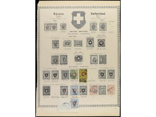 ° SUECIA. 1855-86. Tres páginas de álbum con sellos usados con preciosos matasellos, también sellos de tasas y de Servicio y enteros postales recortados.