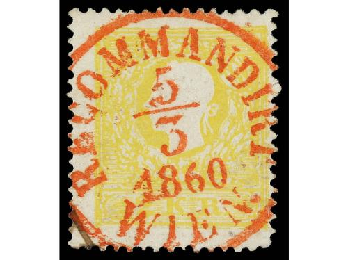 ° AUSTRIA. Yv. 11. 1858-59. 2 kr. amarillo, Tipo II. Mat. fechador RECOMMANDIRT / WIEN en rojo. LUJO.