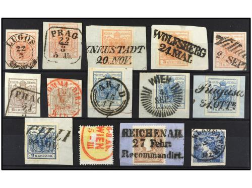 ° Δ AUSTRIA. 1850-59. SELECCIÓN de 14 sellos en usado con matasellos de belleza excepcional, todos con Dictámenes de Ferchenbauer, R. Strakosch, U. Steiner y G. Babor.
