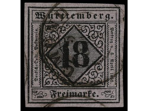 ° ALEMANIA ANTIGUOS ESTADOS: WURTEMBERG. Yv. 5. 1851. 18 kr. violeta gris. Muy bonito.