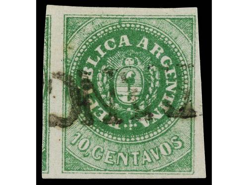 ° ARGENTINA. Yv. 6. 1862-64. 10 ctvos. verde con acento. Mat. lineal FRANCA. MUY BONITO.