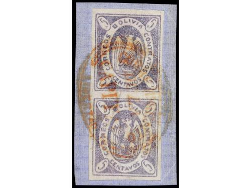 Δ BOLIVIA. Yv. 3 (2). 1867-68. 5 ctvos. violeta pareja sobre fragmento. Mat. ovalado en rojo CORREO DE LA CAPITAL. PRECIOSO.