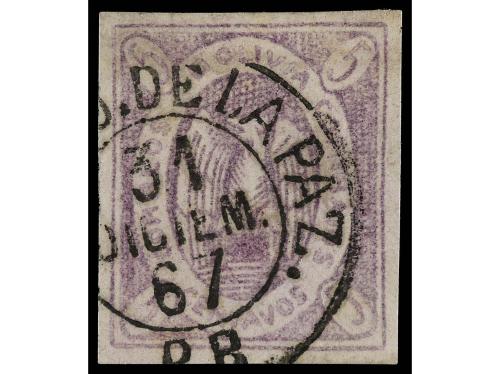 ° BOLIVIA. Yv. 3. 1867-68. 5 ctvos. lila. Mat. fechador de LA PAZ. MAGNÍFICO.