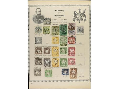 ° ALEMANIA ANTIGUOS ESTADOS: WURTEMBERG. 1851-80. Seis páginas de álbum con sellos usados con preciosos matasellos, también enteros postales recortados.