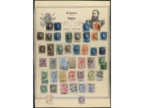 ° BELGICA. 1849-85. Tres páginas de álbum con sellos usados, también sellos de tasas, paquetes postales y enteros postales recortados.