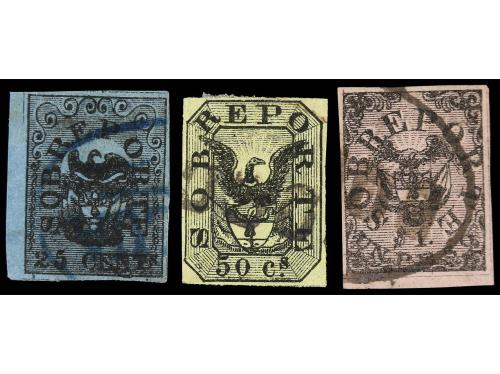 ° COLOMBIA. Yv. T3/5. 1865. SOBREPORTE. Serie completa de tres sellos. PRECIOSOS.