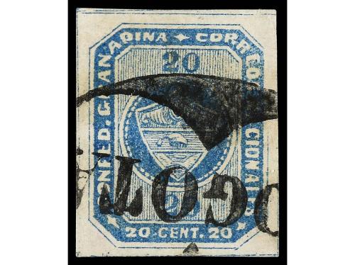 ° COLOMBIA. Yv. 9. 1860. 20 cts. azul. Mat. BOGOTA. Grandes márgenes. LUJO.