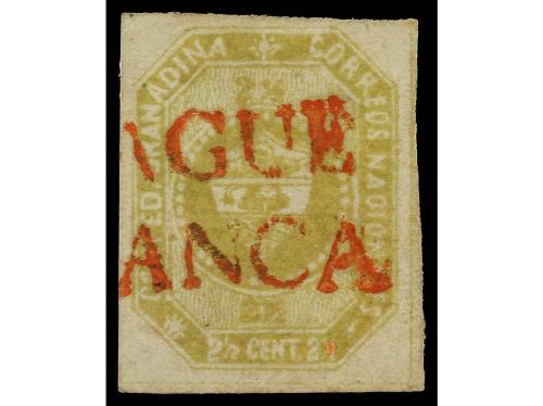 ° COLOMBIA. Yv. 1. 1859. 2 1/2 ctvos. verde oliva. Mat. IBAGUE / FRANCA en rojo. PRECIOSO.