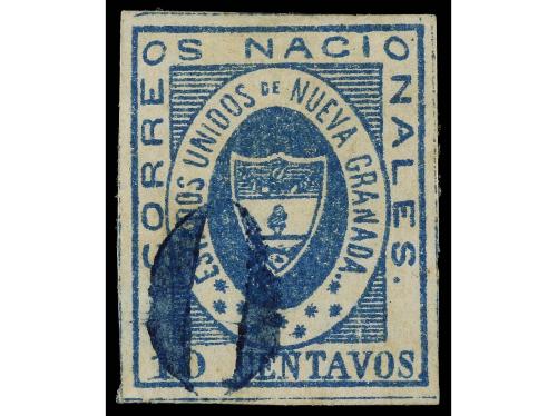 ° COLOMBIA. Yv. 12. 1861. 10 ctvos. azul. Mat. O en azul. PRECIOSO.