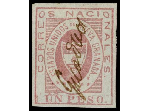 ° COLOMBIA. Yv. 14. 1861. 1 peso rosa. Mat. manuscrito GUADAS. MUY BONITO y RARO matasellos. Cert. COLOMPHIL.