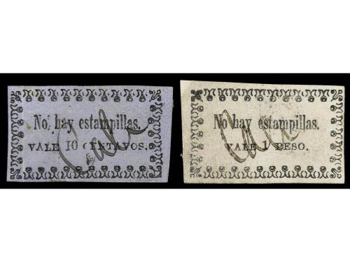 COLOMBIA. (1870 ca.). CALI. Sellos de 10 ctvos. y 1 peso con la leyenda "No hay estampillas" y con habilitación manuscrita "Cali". No reseñados.