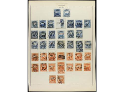 ° COSTA RICA. 1862-83. Dos páginas de álbum con sellos en usado con bonitos matasellos, también sellos de 1/2 real y 2 reales. Ensayos de plancha sobre papel cartón, sellos del Servicio Oficial y enteros postales recortados.