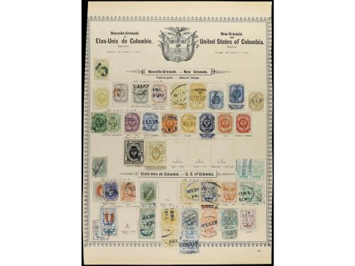 */° COLOMBIA. 1859-85. Cinco páginas de álbum con sellos la mayoría usados con bonitos matasellos, también sello de Tasa y Certificados y enteros postales recortados.