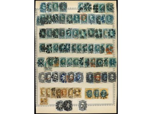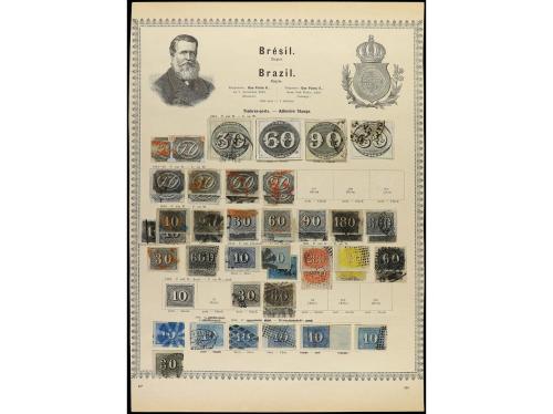 ° BRASIL. 1866-78. Tres páginas de álbum con sellos de las emisiones de DON PEDRO. Alrededor de 200 sellos todos con matasellos interesantes y preciosos, muchos raros.