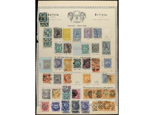 ° BOLIVIA. 1867-87. Página de álbum con sellos usados y algún entero postal recortado.