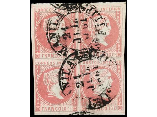 ° FILIPINAS. Ed. 8 (4). 10 cuartos rosa lila. Bloque de cuatro. Mat. fechador de MANILA. Sello RARÍSIMO en usado e infravalorado en el catálogo Edifil. Pocos ejemplares conocidos y sólo dos bloques de cuatro. Cert. CEM.