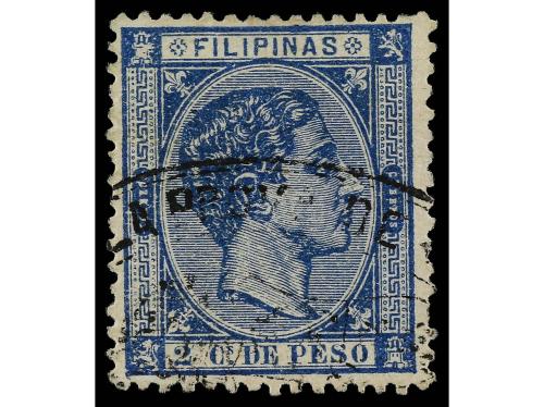 ° FILIPINAS. Ed. 35. 2 ctvos. azul. Mat. ovalado de origen administrativo. Sello catalogado antiguamente como no expendido al no conocerse sellos en usado. RARÍSIMO ASÍ. Cert. CEM.