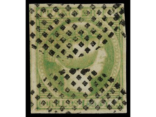 ° PUERTO RICO. 1 real verde (Ant. 2). Mat. PAID / AT / SAN JUAN PORTO-RICO en rojo. RARÍSIMO sobre el sello.