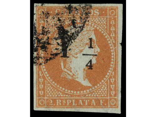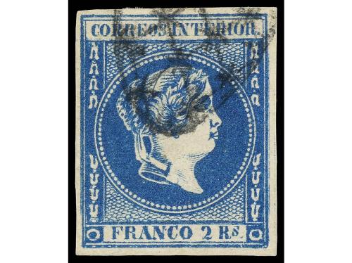 ° FILIPINAS. Ed. 14. 2 reales azul. Mat. Parrilla Colonial. Sello RARÍSIMO en usado e infravalorado en el catálogo. No existen más de cinco ejemplares. Firmas Brun y Ferchenbauer.