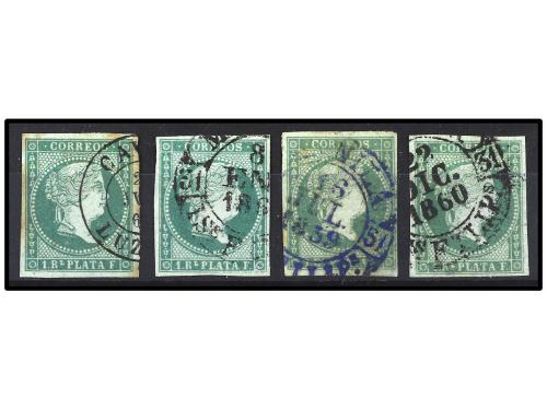 ° FILIPINAS. Ed. 6a. 1 real verde. Cuatro sellos, uno con fechador de CAVITE y tres con fechador de MANILA (uno en azul). PRECIOSOS.