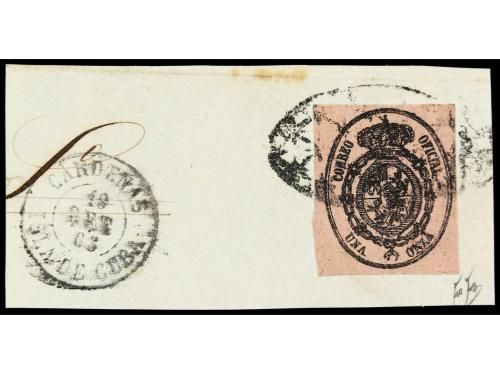 Δ CUBA. Ed. 7A. 1 onza negro s. rosa LITOGRAFIADO DE LA HABANA sobre pequeño fragmento. Mat. Parrilla Colonial y fechador CARDENAS / ISLA DE CUBA.