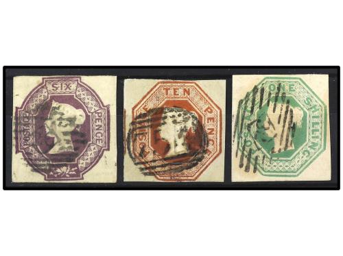 ° GRAN BRETAÑA. Yv. 5/7. 1847-54. 6 d. malva, 10 d. castaño y 1 sh. verde. Preciosos ejemplares con márgenes completos y matasellos limpios.