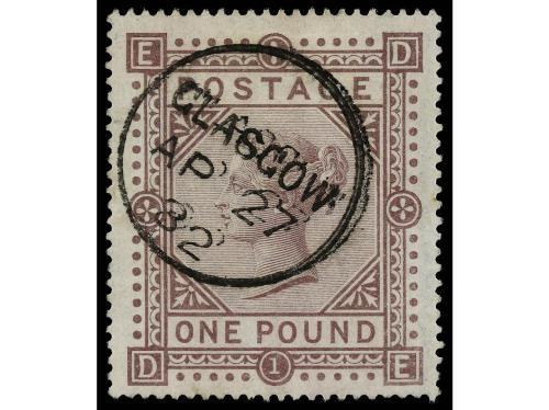 ° GRAN BRETAÑA. Ed. 42. 1867. 1 libra castaño violeta, filigrana Cruz de Malta. Mat. fechador de GLASGOW. MAGNÍFICO.