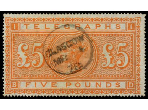 ° GRAN BRETAÑA. Yv. T-11. 1870-80. TELÉGRAFOS. 5 libra naranja. Mat. fechador de GLASGOW. Precioso y RARO en esta calidad.