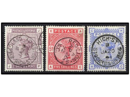 ° GRAN BRETAÑA. Yv. 86/88. 1883-84. 2/6 sh. violeta, 5 sh. rosa y 10 sh. azul. Todos con fechadores en el centro. LUJO.