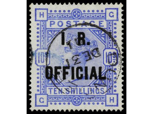 ° GRAN BRETAÑA. Yv. O 8. 1885. SERVICIO. 10 sh. azul, restos de lápiz azul a la izquierda del sello. MUY BONITO EJEMPLAR. Cert. B.P.A.