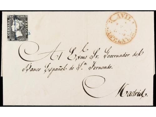 ✉ ESPAÑA. Ed. 1. 1850. BARCO a MADRID. 6 cuartos negro, pl. I mat. araña y fechador PIEDRAHITA/CAST. LA V. El sello presenta la falta de la primera línea del pelo antes del retoque (Guezala I-4 pag. 171). PRECIOSA.