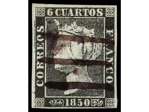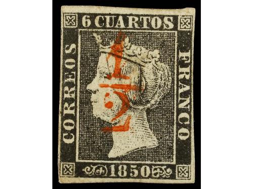 ° ESPAÑA. Ed. 1. 6 cuartos negro, pl. I tipo 14. Mat. "14" en rojo de origen desconocido. EXCEPCIONAL. ÚNICA CONOCIDA. Cert. GRAUS y COMEX. Procedencia: Jean Dupont, Pedro Miranda.