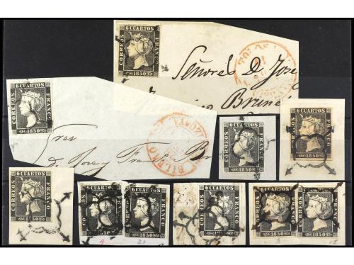 ° ✉ ESPAÑA. Ed. 1 y 1A. 6 cuartos negro. Conjunto de ocho sellos y una carta con variedades de impresión.