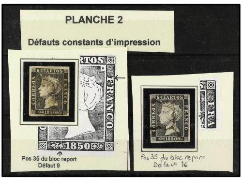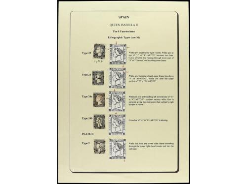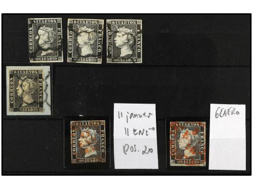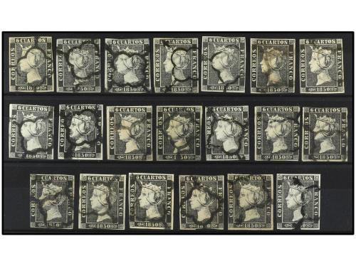 ° ESPAÑA. Ed. 1 y 1A. 6 cuartos negro. Conjunto de 20 sellos con diversas variedades, montada en hojas de álbum con descripciones, varias con matasellos fechador.