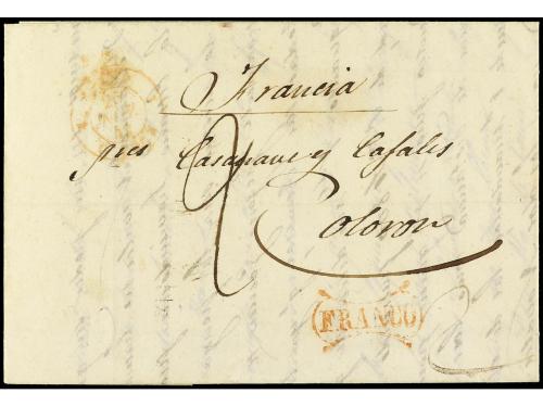 ✉ ESPAÑA: PREFILATELIA. 1844. LA FRESNEDA a FRANCIA. Fechador ALCAÑIZ/TERUEL y FRANCO general, manuscrito "Franco Losignac" del Administrador de esta cartería. Marca inédita. RARÍSIMA.