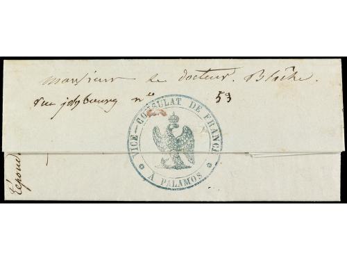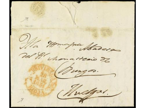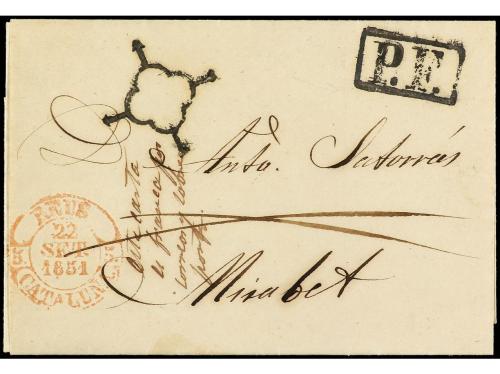 ✉ ESPAÑA: PREFILATELIA. 1851. REUS a MIRABET. Circulada con la marca P.F. (Porte Franco) fechador "araña" al haber satisfecho el porte en origen. PRECIOSA y RARA.
