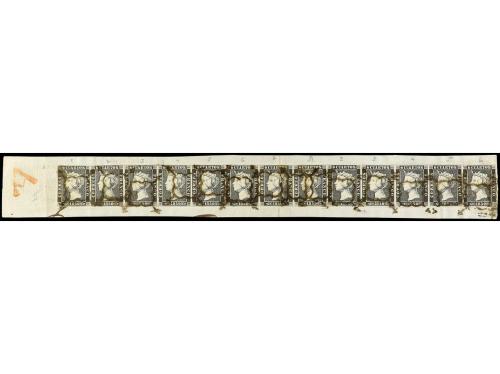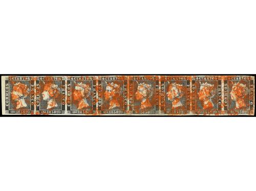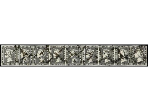 ° ESPAÑA. Ed. 1A (8). 6 cuartos negro, pl. II. Tira de nueve sellos, márgenes completos. PRECIOSA.