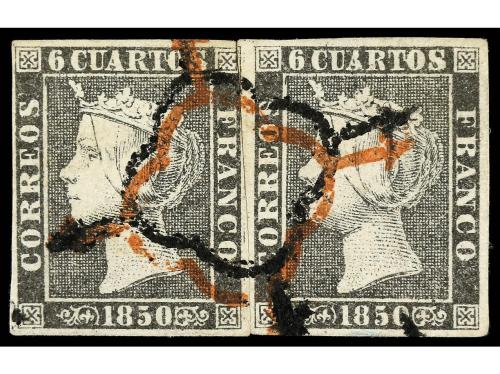 ° ESPAÑA. Ed. 1A (2). 6 cuartos negro, pareja (recompuesta). Doble mat. negro y rojo. Precioso e inhabitual.